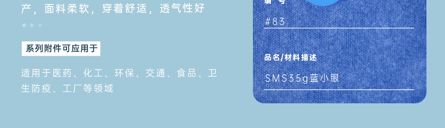 主要成分:聚丙烯 克重:83g 顏色:藍(lán)小眼 產(chǎn)品用途:適用于醫(yī)藥、化工、環(huán)保、交通、食品、衛(wèi)生防疫、工廠等領(lǐng)域