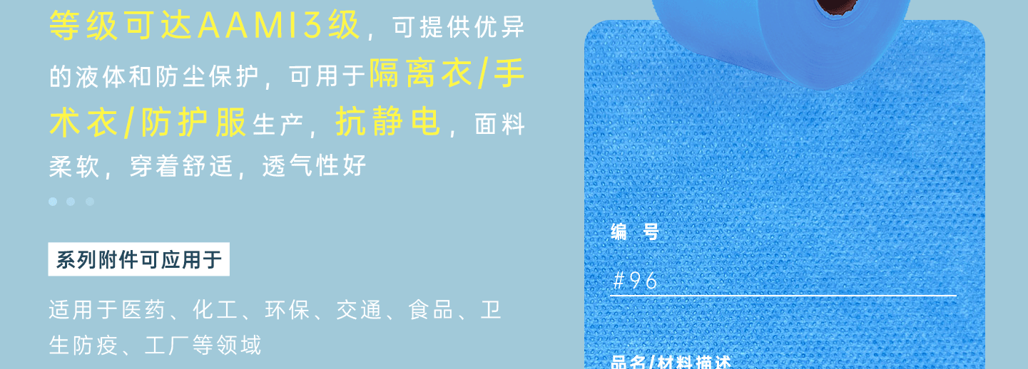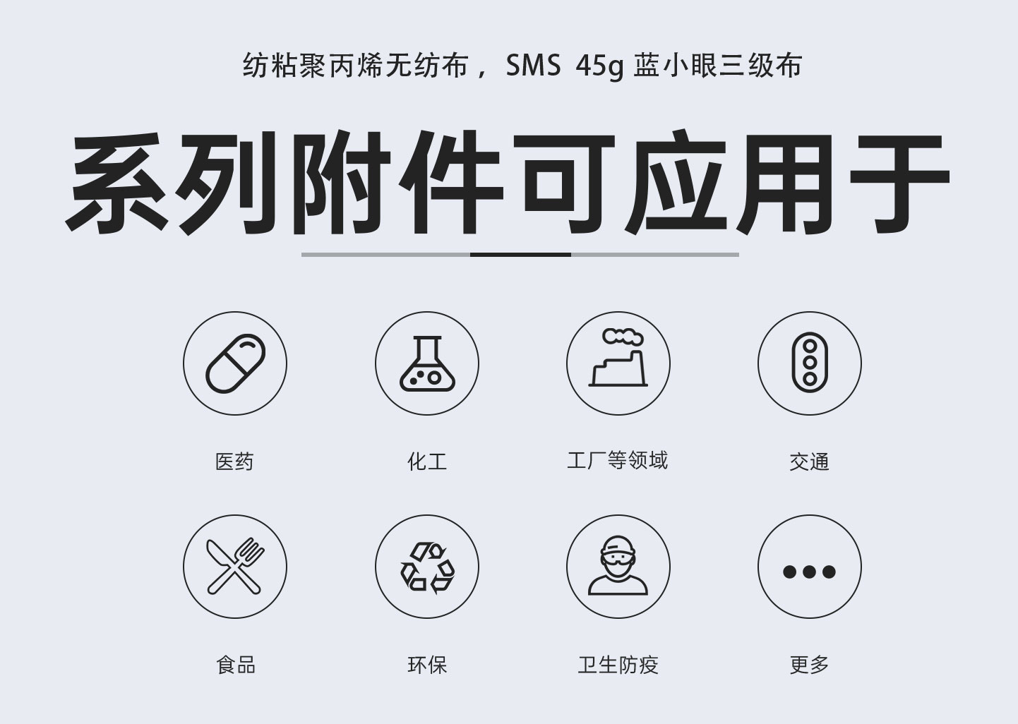 主要成分:PP+PE 克重:45g 顏色:藍(lán)色 產(chǎn)品用途:適用于醫(yī)藥、化工、環(huán)保、交通、食品、衛(wèi)生防疫、工廠等領(lǐng)域