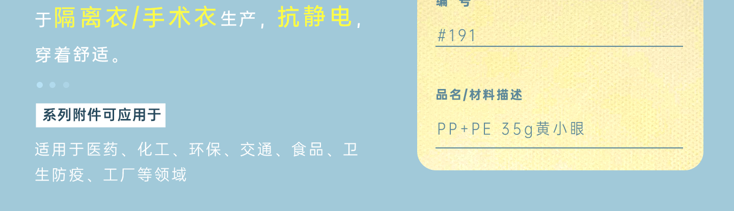 主要成分:SMS+PE 克重:35g 顏色:黃色 產(chǎn)品用途:適用于醫(yī)藥、化工、環(huán)保、交通、食品、衛(wèi)生防疫、工廠等領(lǐng)域