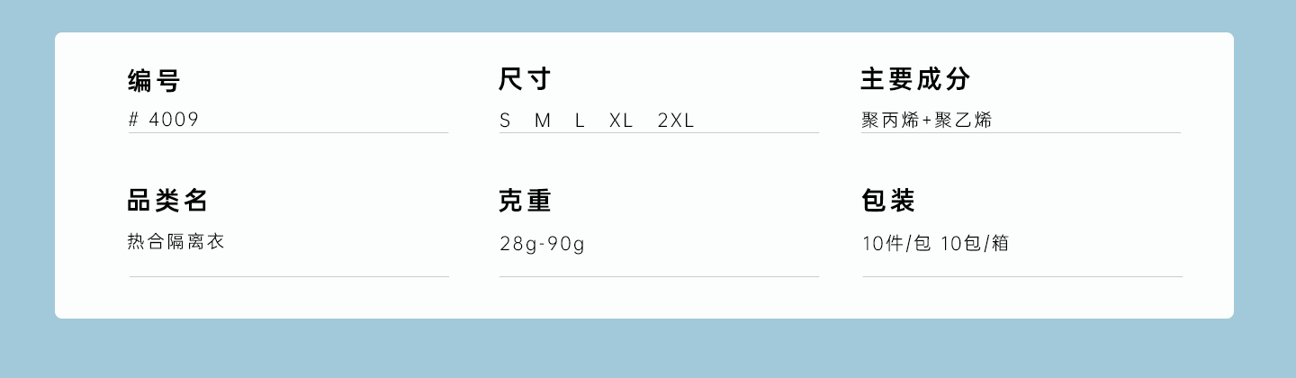 規(guī)格尺寸:S~2XL 主要成分:聚丙烯+聚乙烯 克重:8g-90g 顏色:白色、黃色、藍色 工藝:熱合、拇指扣袖口套頭式、無后背、自身腰帶 包裝:10件/包 10包/箱