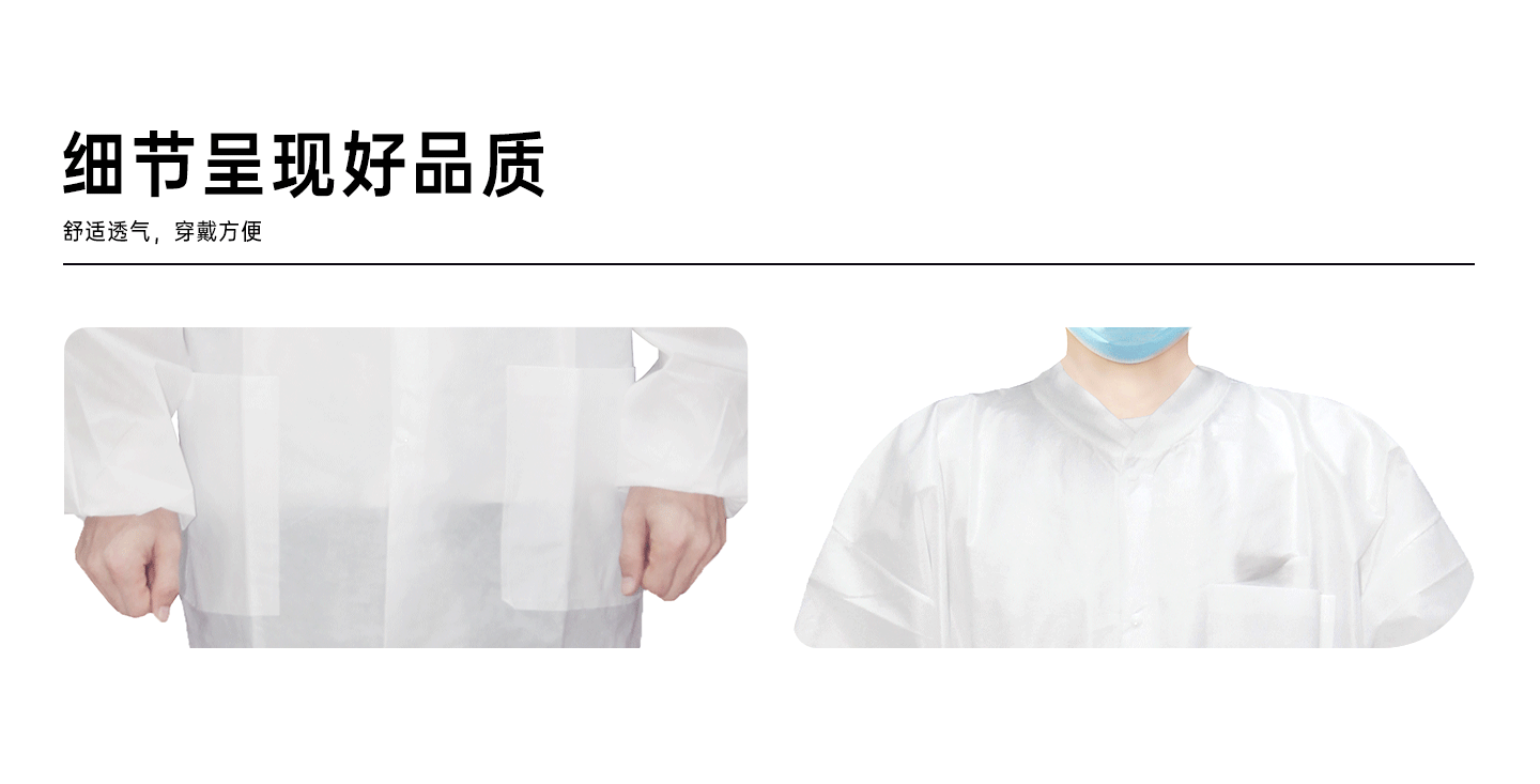 規(guī)格尺寸:S~2XL 主要成分:聚丙烯 克重:25g-50g 顏色:白色、藍(lán)色、深藍(lán)、淺藍(lán)、紫色 工藝:車縫、針織領(lǐng)口、袖口、5扣、三口袋 包裝:10件/袋 10袋/箱